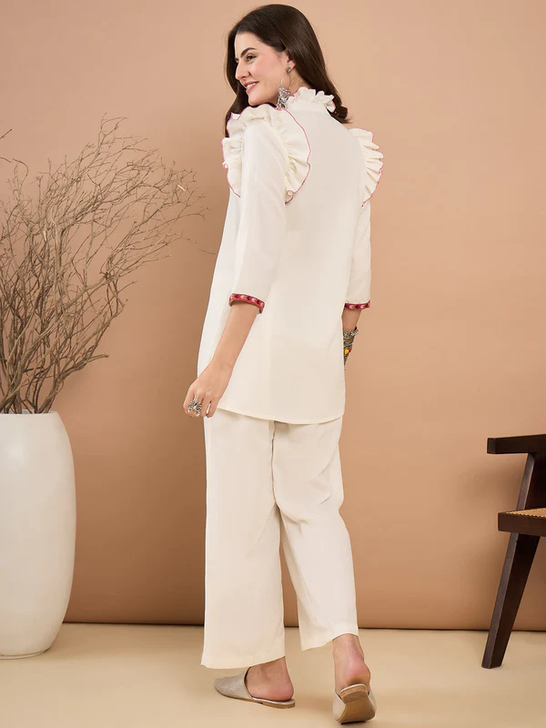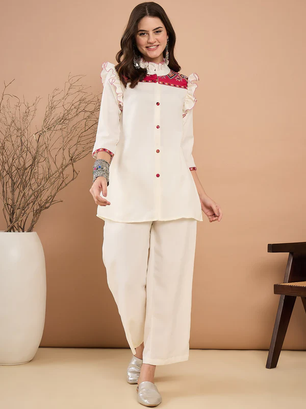 The Printed High Neck Ruffle Shirt with Palazzos Co-Ord is ideal because the wide-leg palazzo gives the appearance of a curved hip, while the ruffle shirt adds volume to the chest.