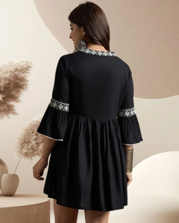 The bell sleeves enlarge the shoulder line, and the flared hem elegantly crosses the hips in this gorgeous embroidered bell sleeve minidress.
