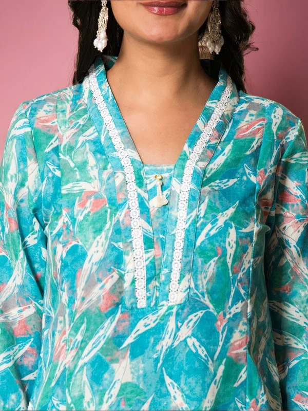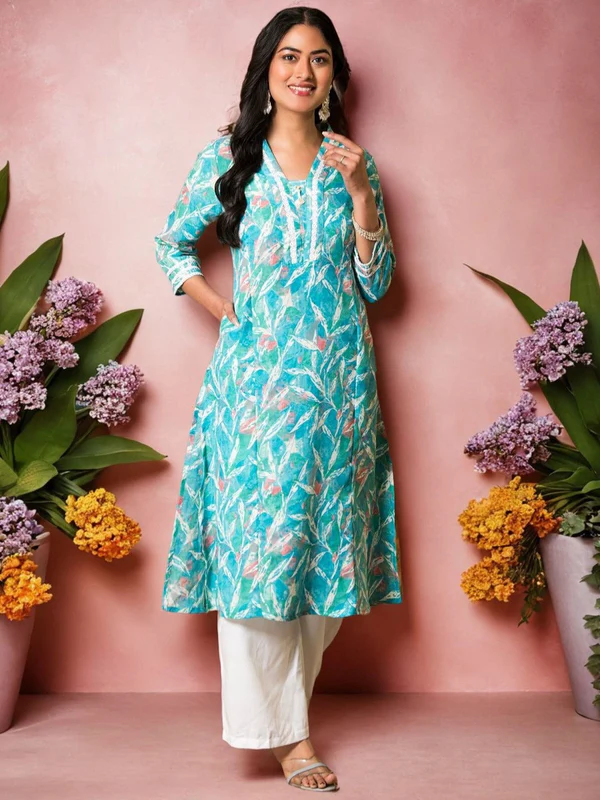 Perfect for all-day summer comfort, the Floral Printed V-Neck Pure Cotton A-Line Kurta is breezy, flattering, and composed of pure cotton.